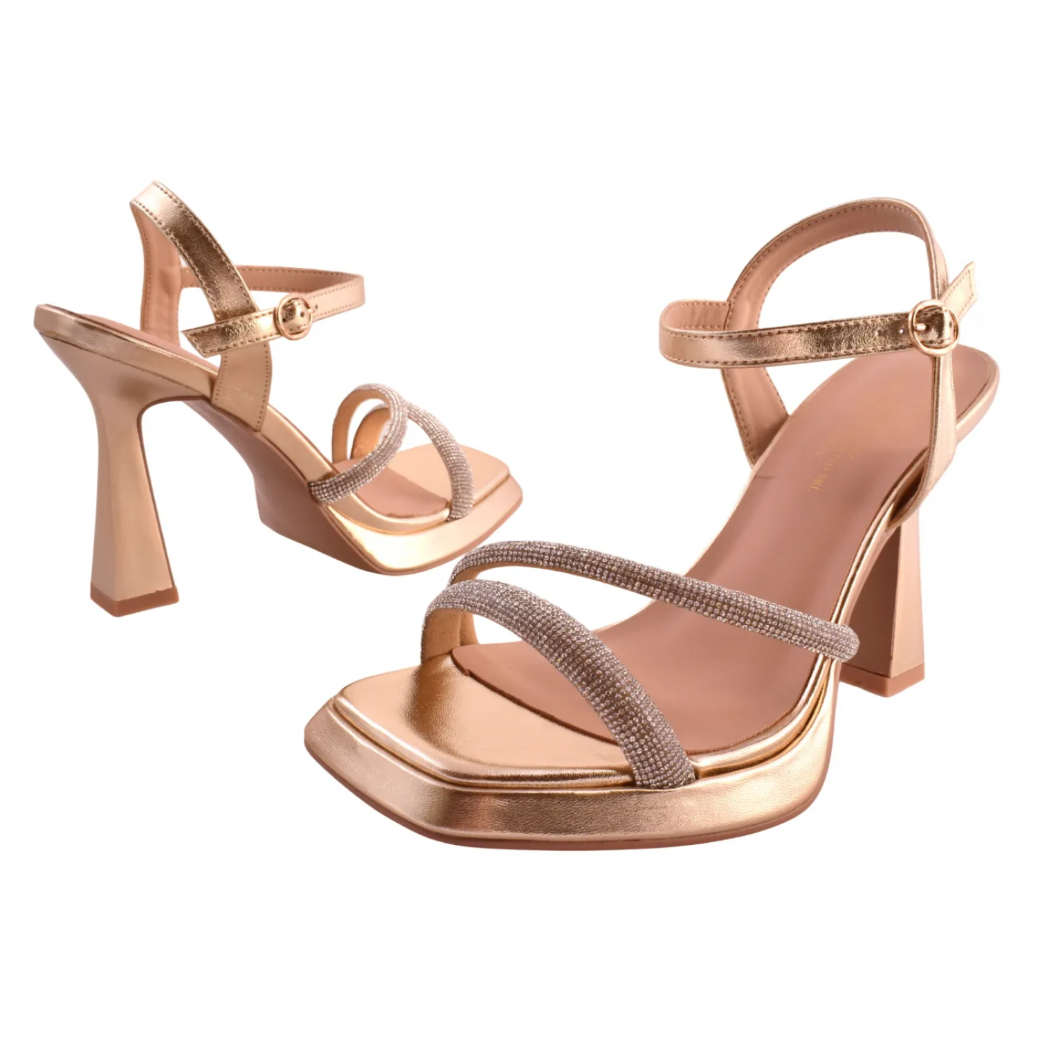 Η μεταλλική ασημί ή χρυσή απόχρωση χαρίζει μια διακριτική λάμψη που τραβά τα βλέμματα, ενώ τα λαμπερά λουράκια με strass στο μπροστινό μέρος προσθέτουν μία glamorous πινελιά, ιδανική για βραδινές εμφανίσεις αλλά και ιδιαίτερες περιστάσεις.